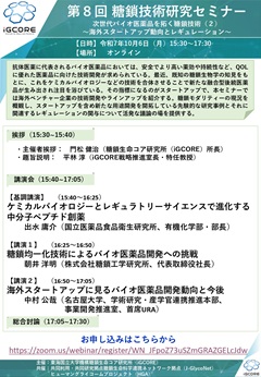 東海国立大学機構糖鎖生命コア研究拠点(iGCORE)では、「糖鎖」に関する研究力の向上とともに、我が国のイノベーション創出を実現すべく、「第8回 糖鎖技術研究セミナー」を開催いたします。