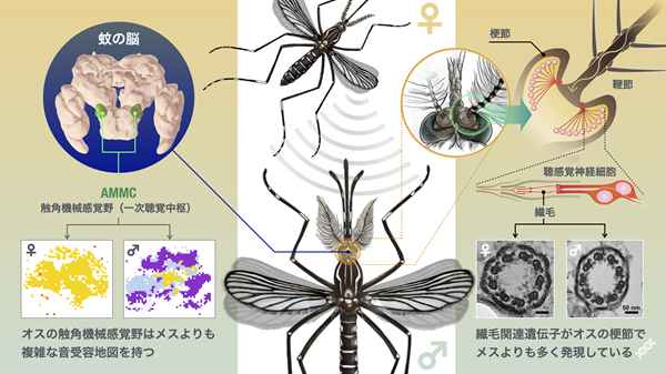 近年は研究対象を蚊へと広げ、配偶行動を支える聴覚の神経・感覚機構の研究にも取り組んでいます。ショウジョウバエで確立した視点を踏まえ、異なる昆虫種を比較することで、聴覚システムの進化的多様性と共通性の理解が進み、昆虫聴覚研究をより広い視野から発展させることができると期待しています。